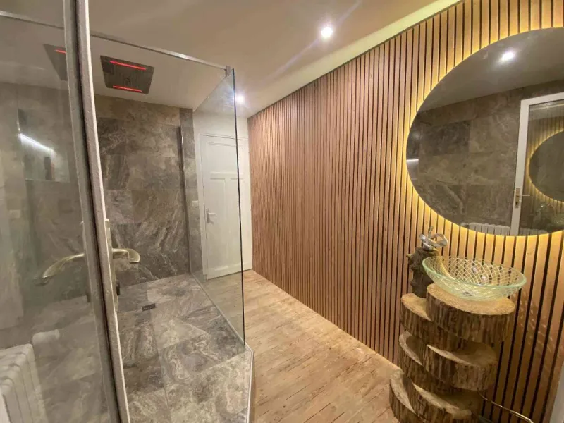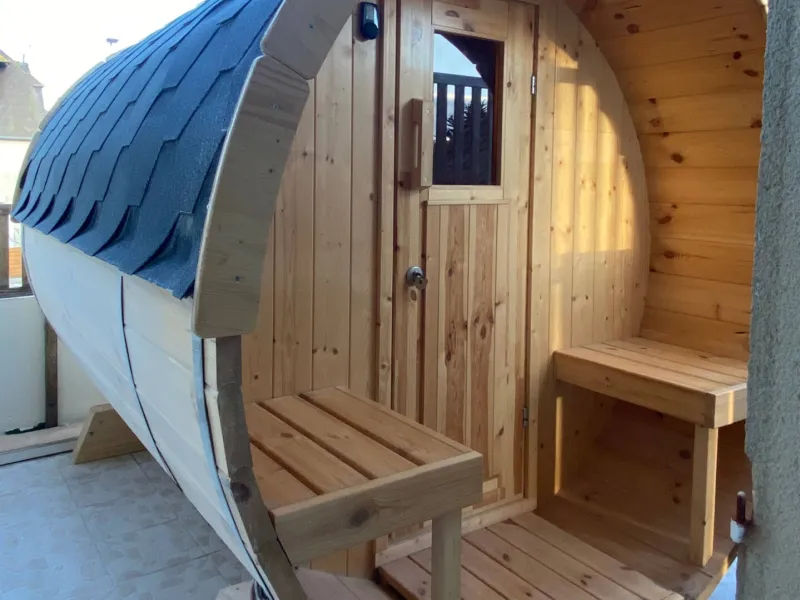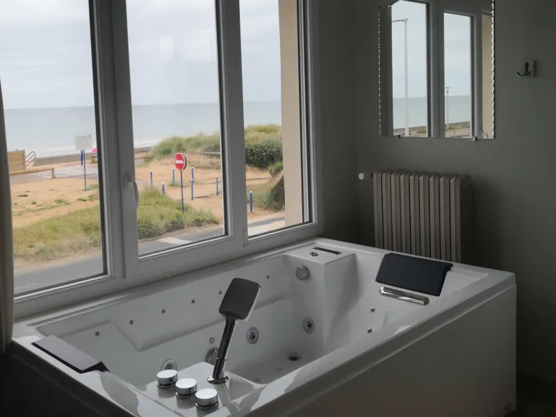 Upstairs, a Zen-style bedroom facing the sea, queen-size bed under a starry LED sky. Herbal tea room and fitness area facing the sea, with an en suite whirlpool bath in front of the bay window and hydromassage bed. Large sensory shower opening onto the terrace where you will find the sauna equipped with a Huum stone stove. WC.