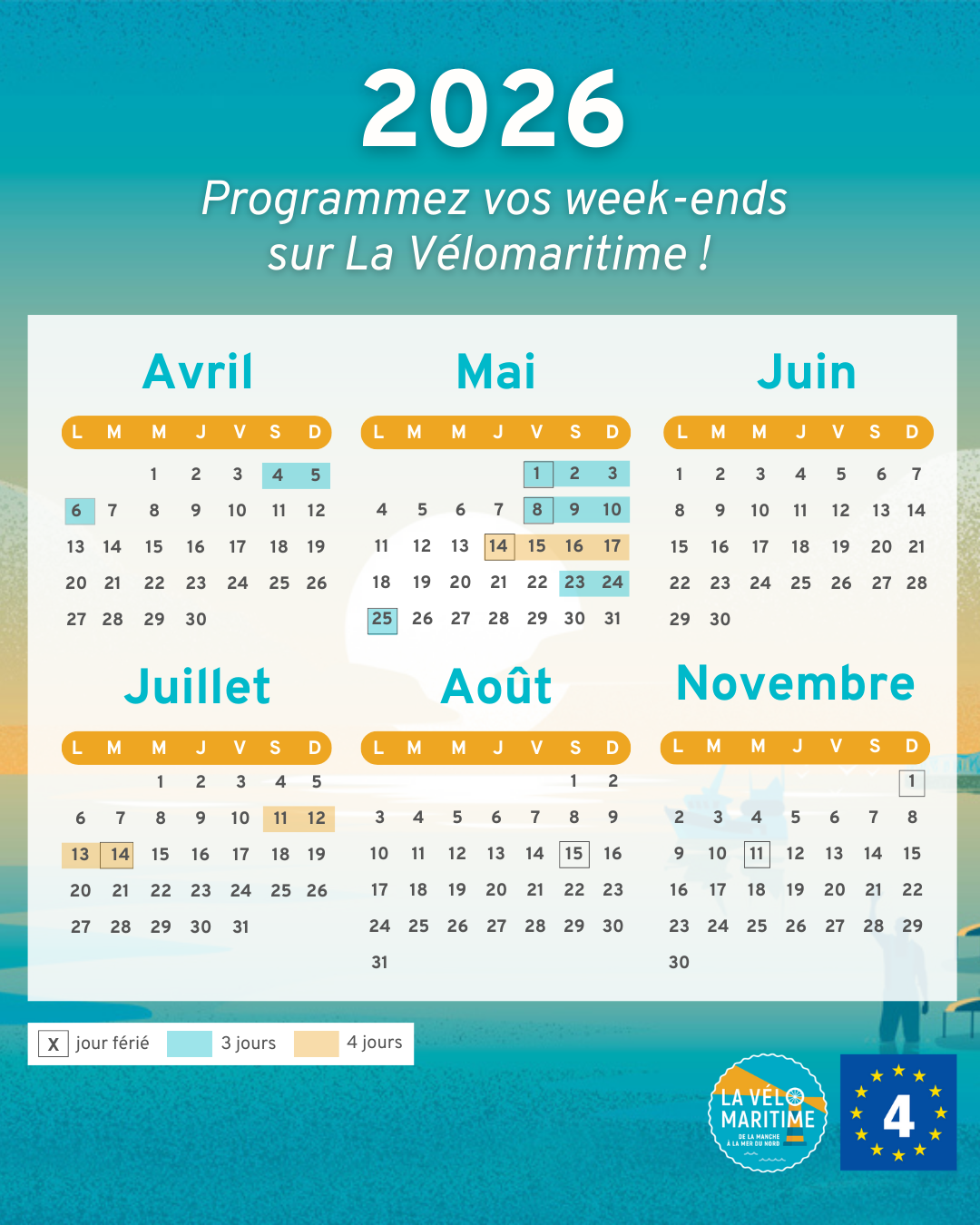 🗓️ Le calendrier 2026 est une véritable invitation au voyage ! Avec 4 week-ends prolongés (dont les lundis de Pâques et de Pentecôte) et des opportunités de ponts en mai et juillet, les occasions ne manqueront pas pour s'évader 🚴‍♀️. C’est le moment idéal pour planifier vos étapes sur La Vélomaritime et explorer nos côtes, de la Manche à la Mer du Nord 🥳.